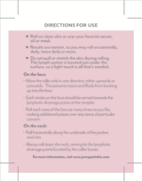 On the neck: Roll horizontally along the underside of the jaw line and chin. Always roll down the neck, aiming for the lymphatic drainage points located by the collar bones.